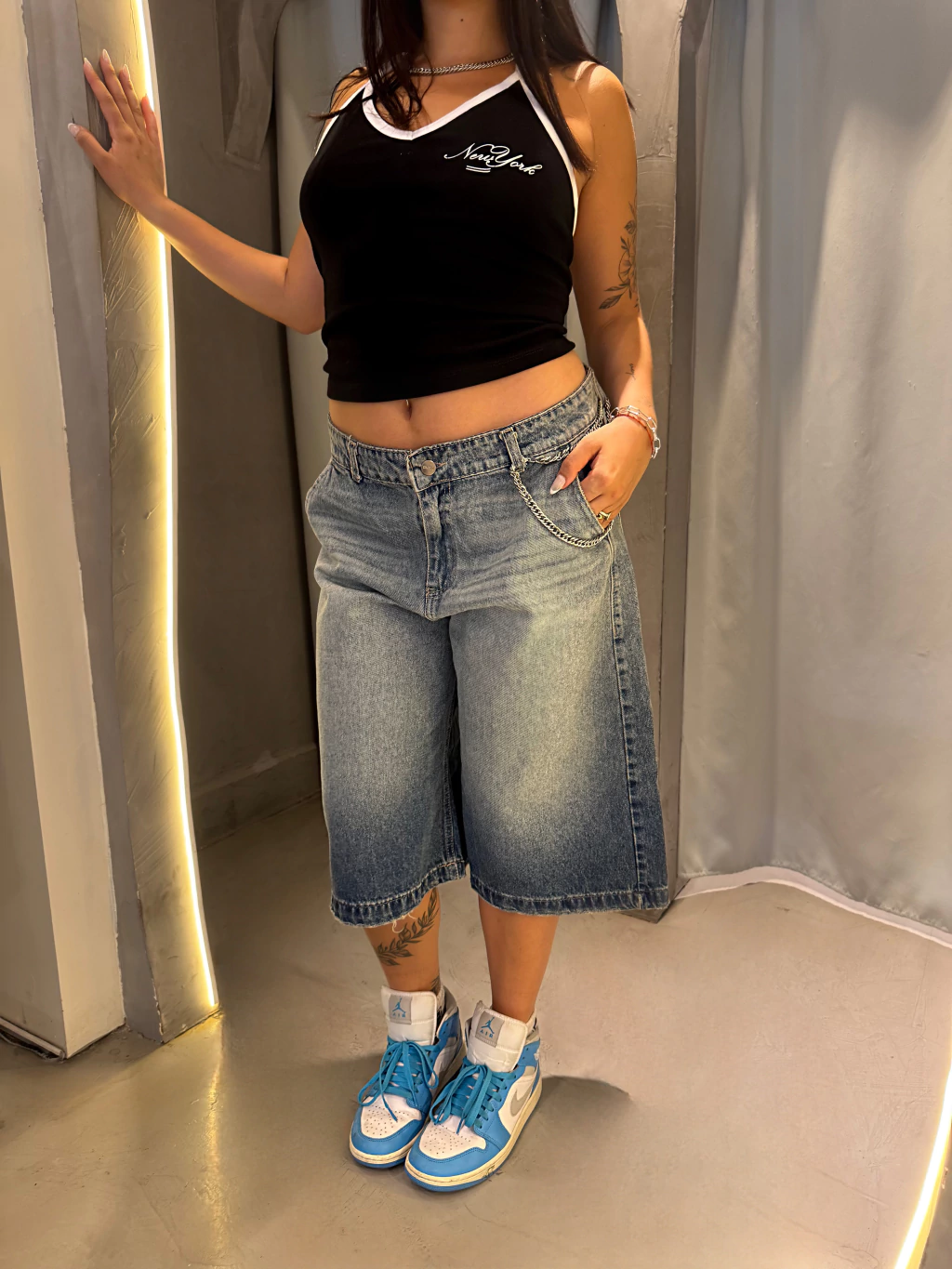 La bermuda que redefine el clásico jean. Confeccionada en denim de lavado claro, tiene un corte recto y tiro medio con calce relajado que le da un aire urbano y cómodo. Su largo por debajo de la rodilla y el efecto gastado la hacen ideal para looks con actitud.