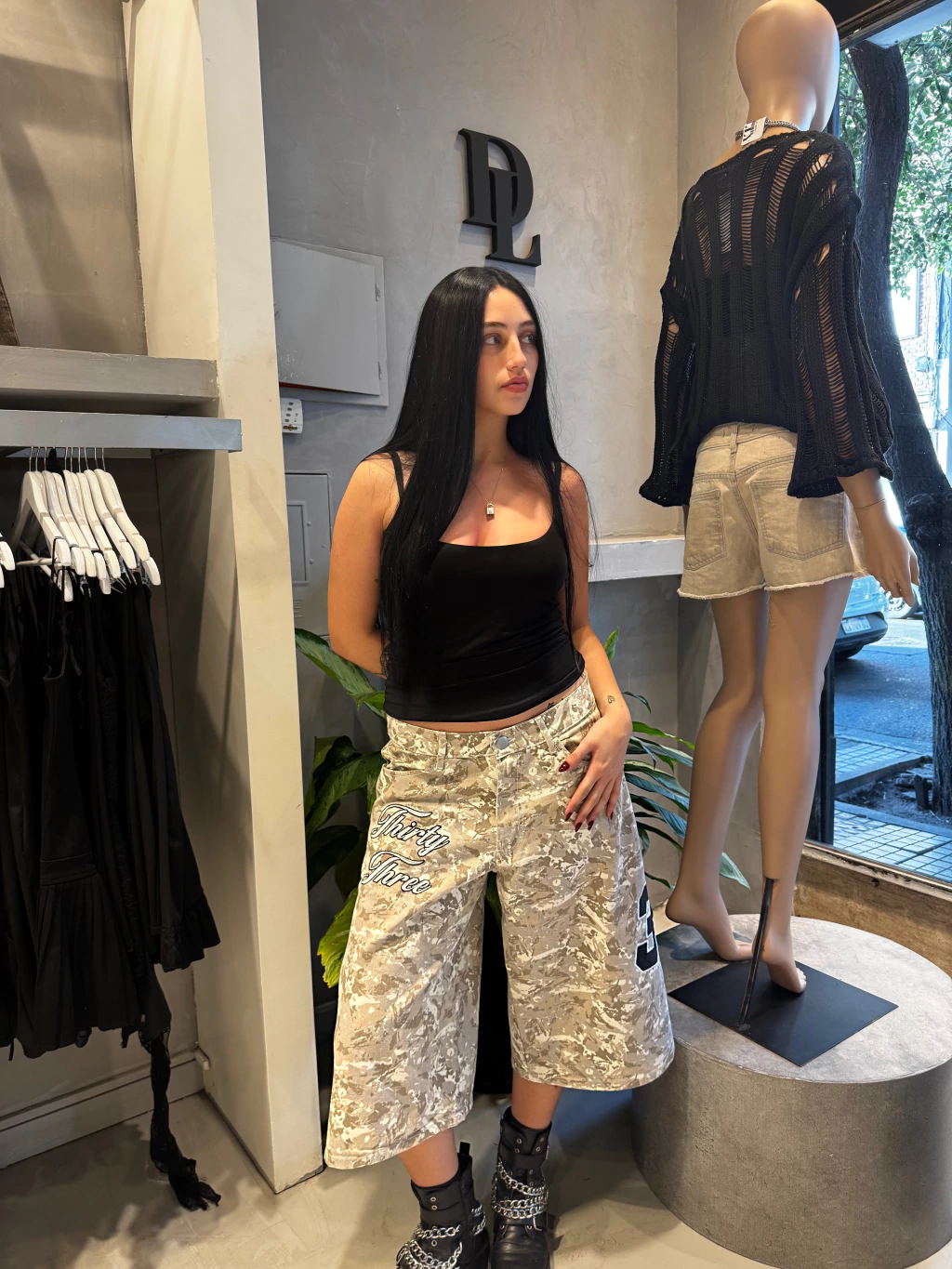 Con un estampado camuflado en tonos neutros, esta cargo wide leg tiene ese fit oversized perfecto que baja actitud sin esfuerzo. Liviana, canchera y comodísima para todos los días.