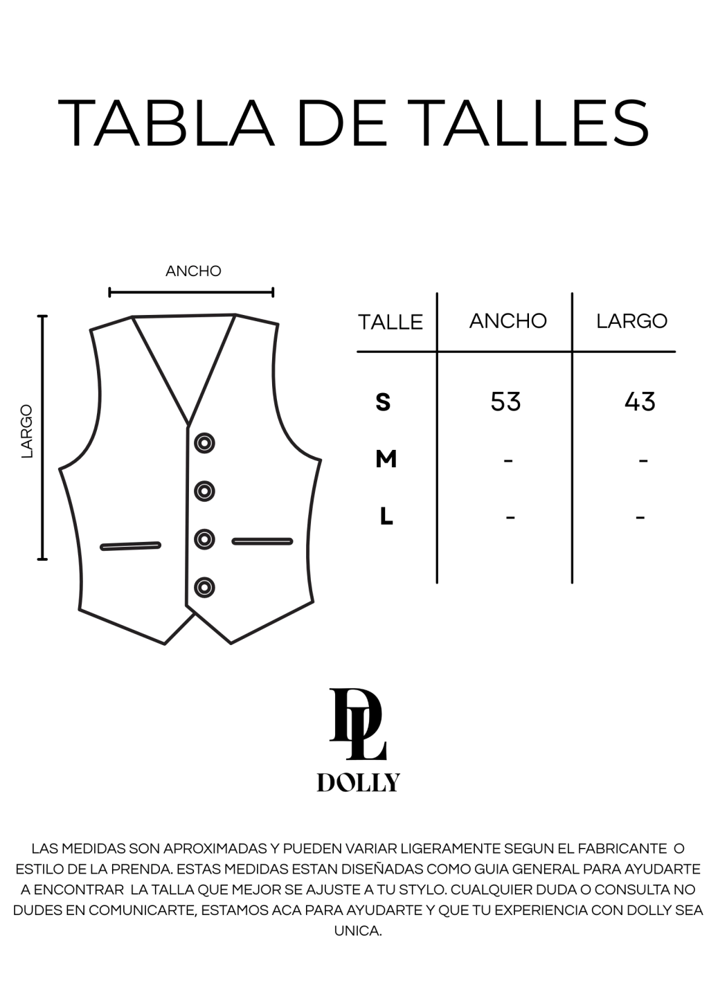Este chaleco sastrero es la prenda que eleva tu estilo con un toque de sofisticación. Con un corte impecable y una estructura pensada para resaltar tu figura, este chaleco es perfecto para crear un look profesional o para añadir un toque de distinción a tu outfit diario. Su diseño clásico y elegante lo convierte en una pieza versátil que combina tanto con camisas como con blusas, brindando siempre un toque de modernidad