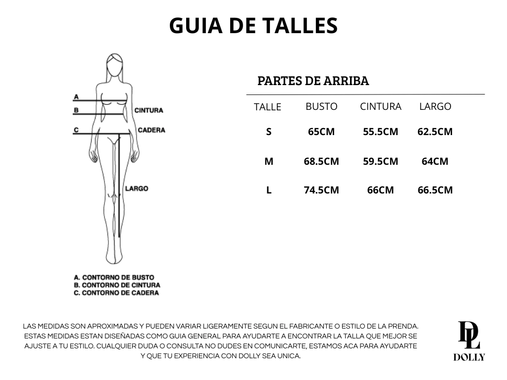 Talle S= Ancho busto: 65cm / Ancho cintura: 55.5cm / Largo: 62.5cm