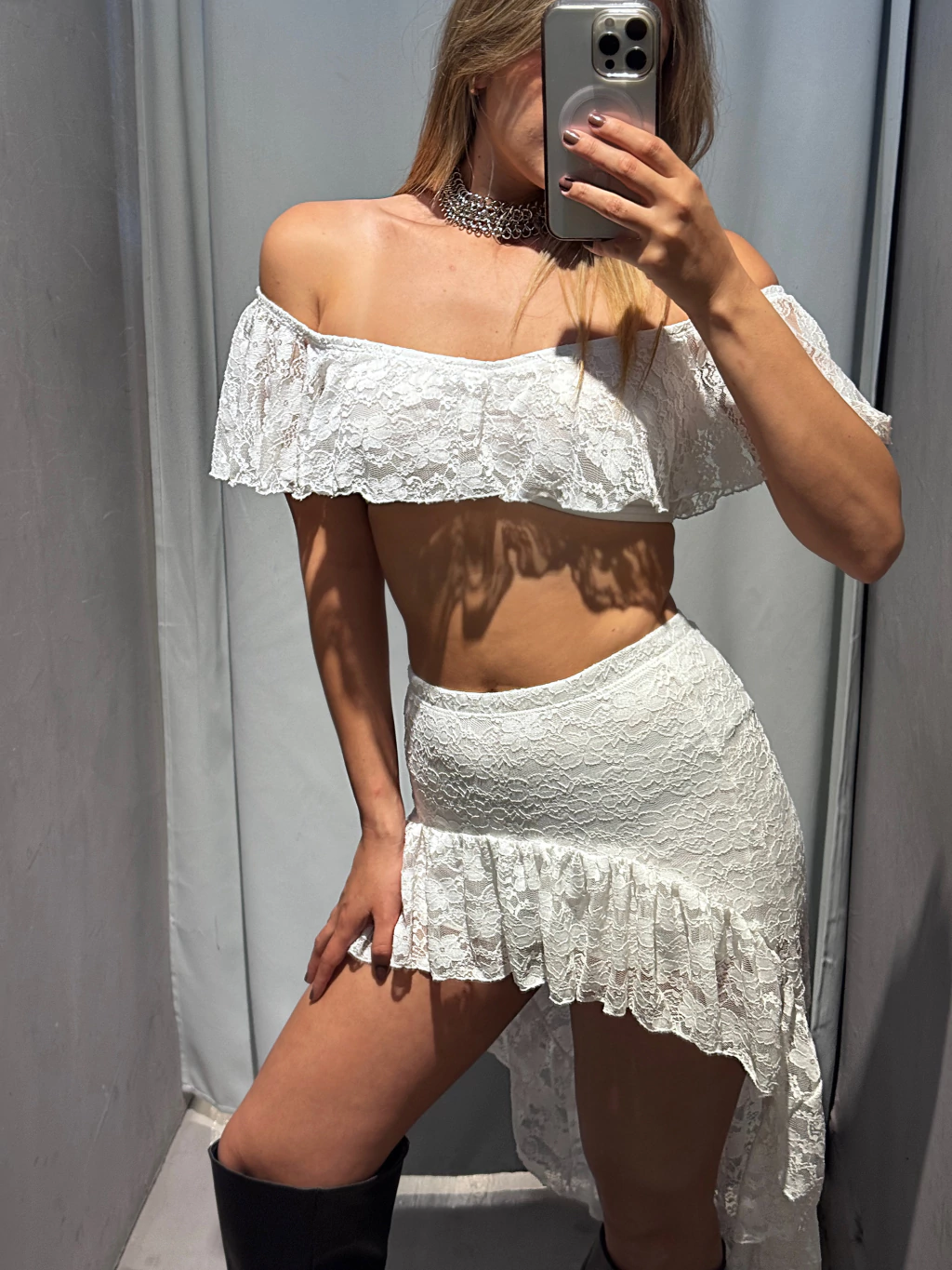 Top corto de encaje, con volados, que le aportan un toque femenino y con mucho estilo. La tela tiene textura delicada y elástica, lo que garantiza un calce cómodo y adaptable al cuerpo. Su largo justo lo hace ideal para usar con la falda del mismo material o combinar con jeans, shorts o pantalones de tiro alto. Una prenda versátil, canchera y con ese aire romántico que levanta cualquier look.