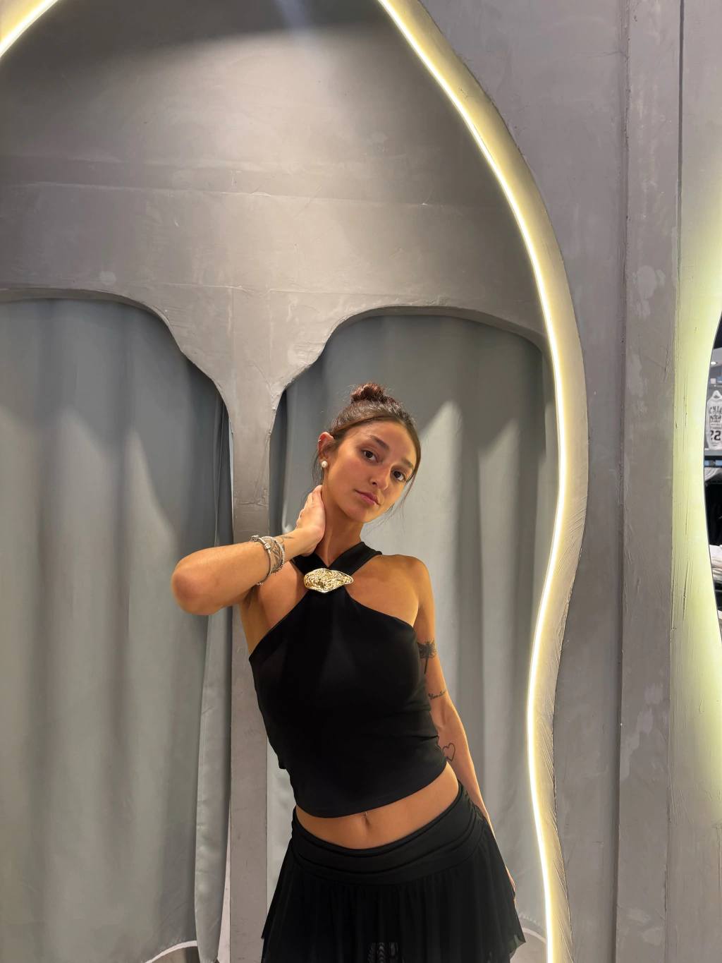 Su diseño se destaca por el detalle de almeja metálica en el centro del pecho, un toque distintivo que eleva la prenda al instante. Desde ese punto nacen dos tiras que se cruzan por sobre los hombros, creando un escote elegante y moderno que enmarca el torso de manera estilizada.