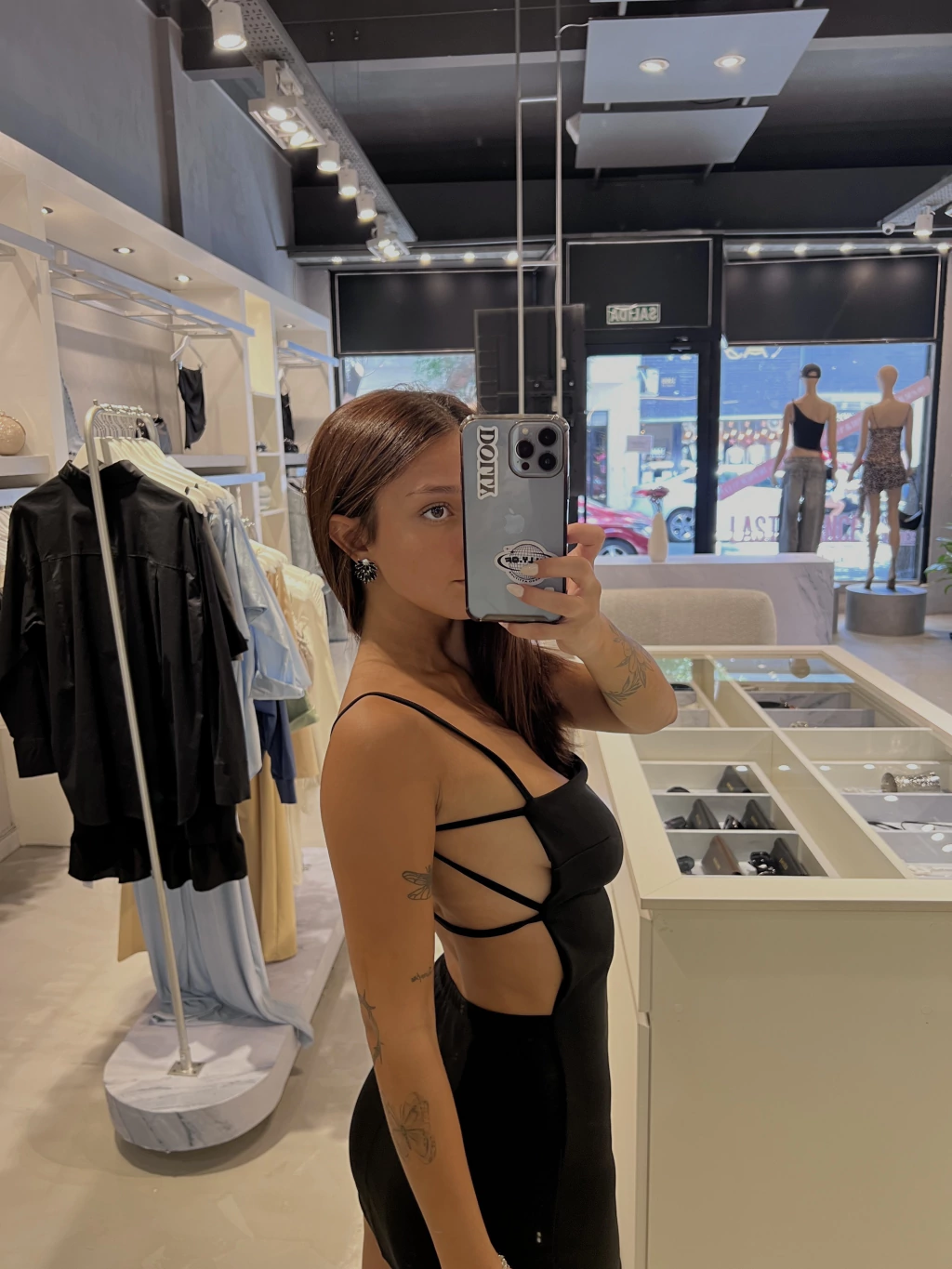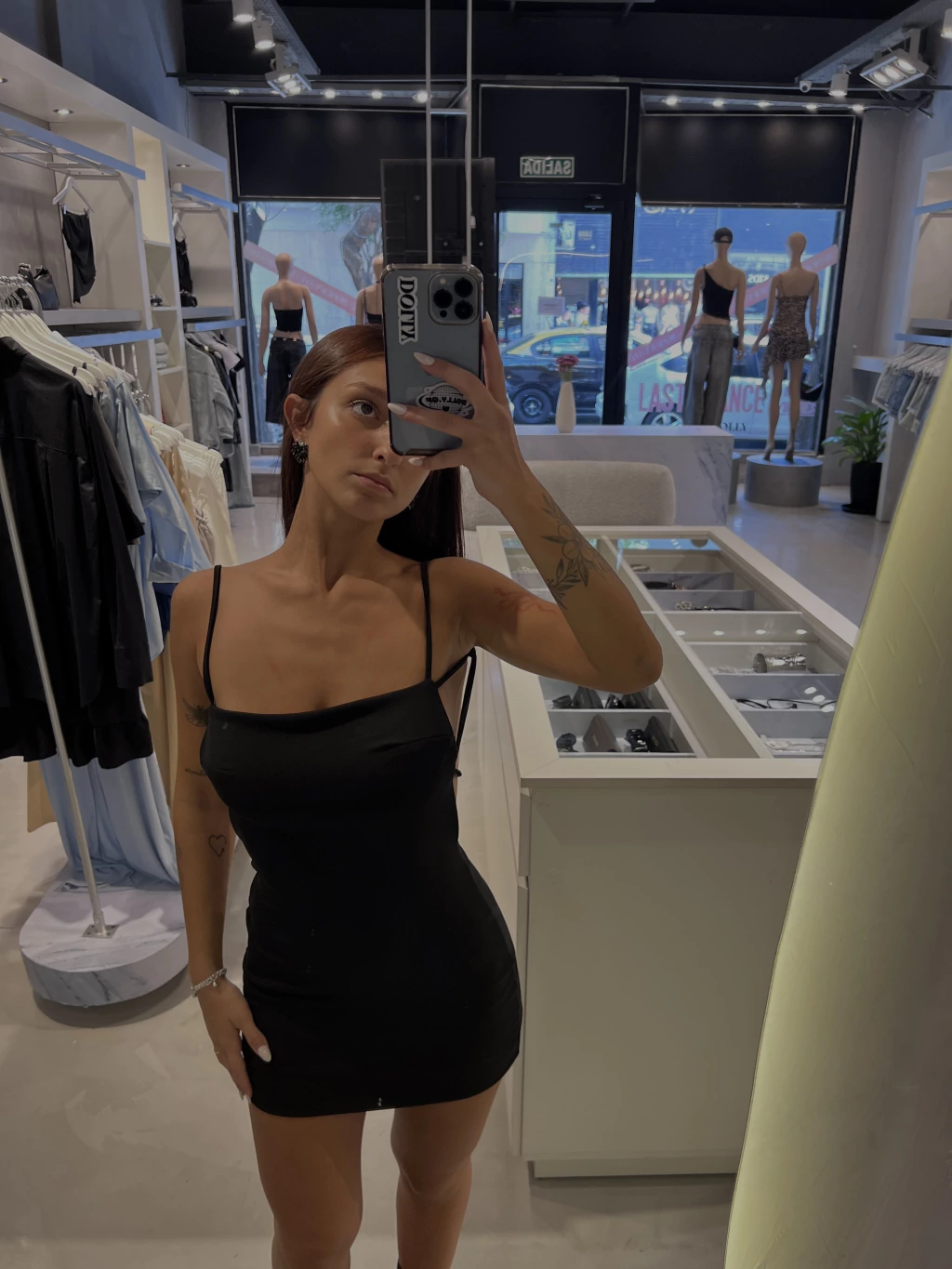 El little black dress que no te puede faltar. Este vestido corto, de breteles finos y escote recto, se ajusta al cuerpo realzando la silueta con un calce impecable. Espalda descubierta. Confeccionado en una lycra firme y cómoda, es ese básico infalible que se adapta a cualquier plan: una cena, una salida o un evento de noche. Minimalista, sexy y con toda la actitud Dolly.