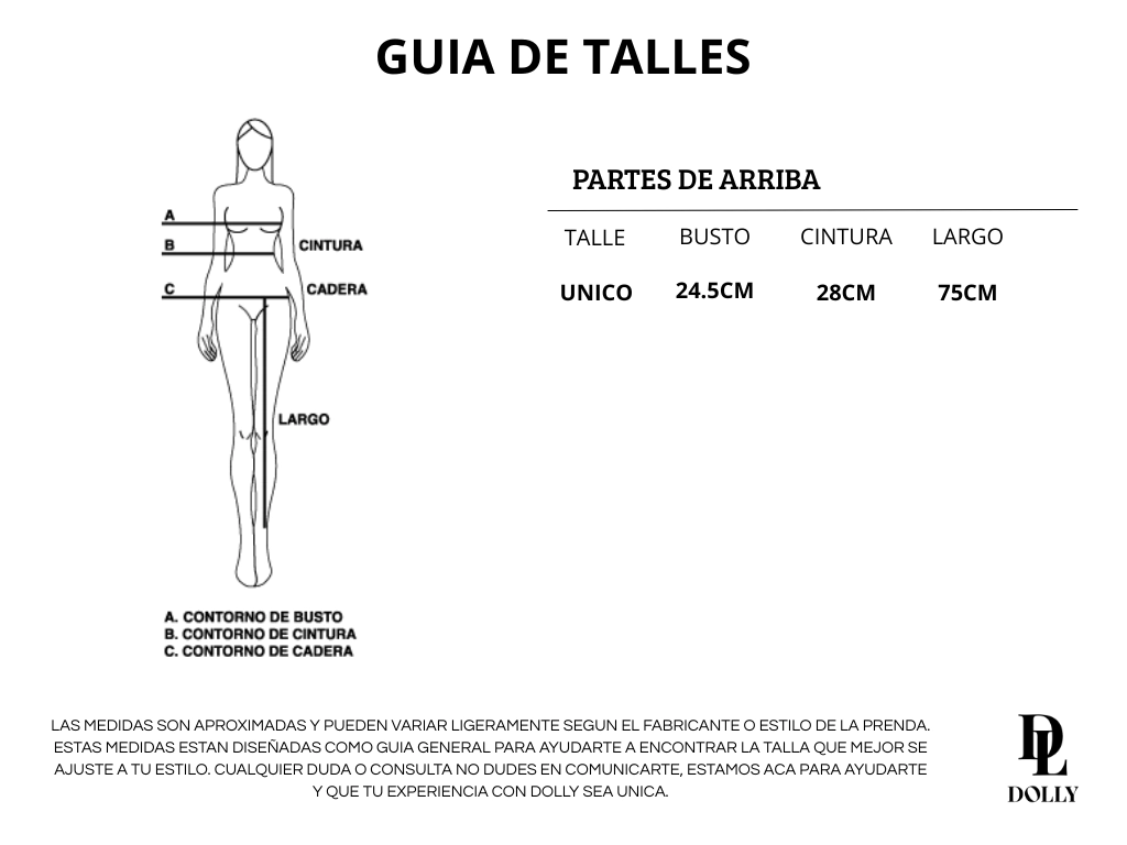 MEDIDAS: Ancho busto: 24.5cm / Ancho cintura: 28cm / Largo: 75cm