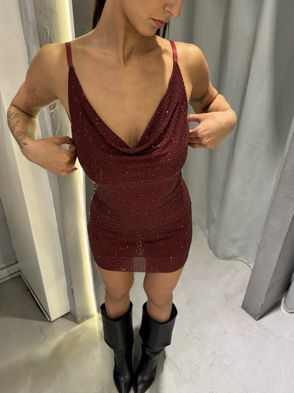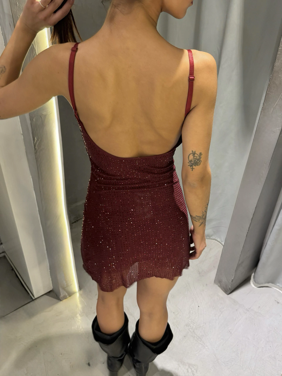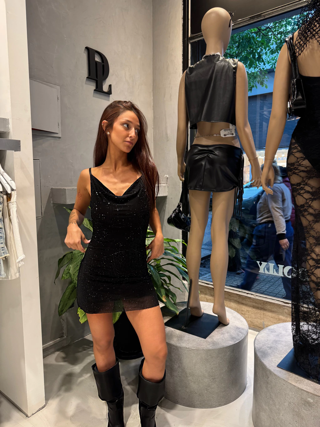 Vestido corto confeccionado en tela con apliques de piedras que le dan un brillo intenso y lleno de movimiento. Tiene escote drapeado, tiras finas regulables y espalda semi descubierta que realza la silueta. Su calce es entallado en el busto y se vuelve más suelto por debajo de la cadera, logrando una caída cómoda y favorecedora. Ideal para looks de noche con mucho estilo y presencia.