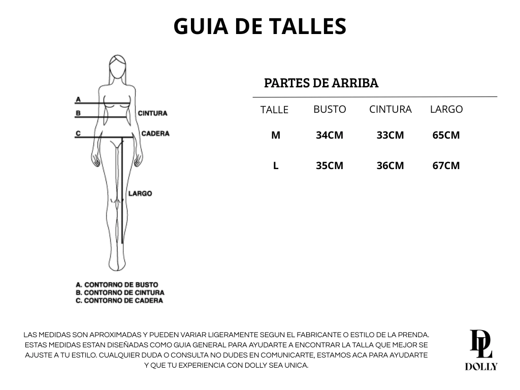 Talle M= Ancho busto: 34cm / Ancho cintura: 33cm / Largo: 65cm